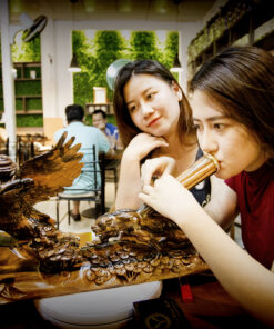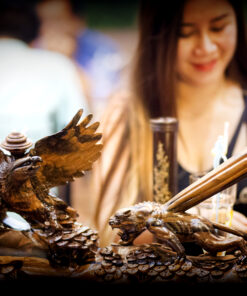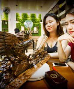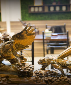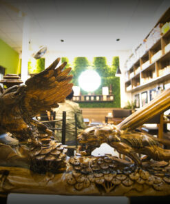 Sản phẩm được đục thủ công nguyên khối từ gỗ mun, tạo dáng 2 con vật bá chủ đất- trời đang dương oai múa võ, đọ trí so tài.