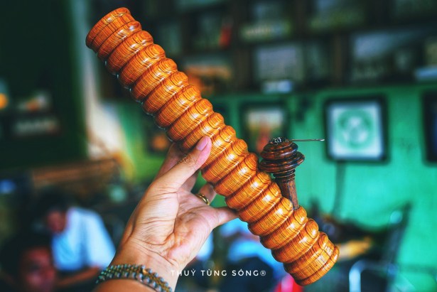 Điếu cày thuỷ tùng sóng dài 33cm, có màu vàng nhạt hoặc xanh nhạt đặc trưng nhưng những đường vân của gỗ thuỷ tùng kết hợp với chế tác lượn sóng tạo nên sự độc đáo và vô cùng đẹp mắt trong nghệ thuật tạo hình.